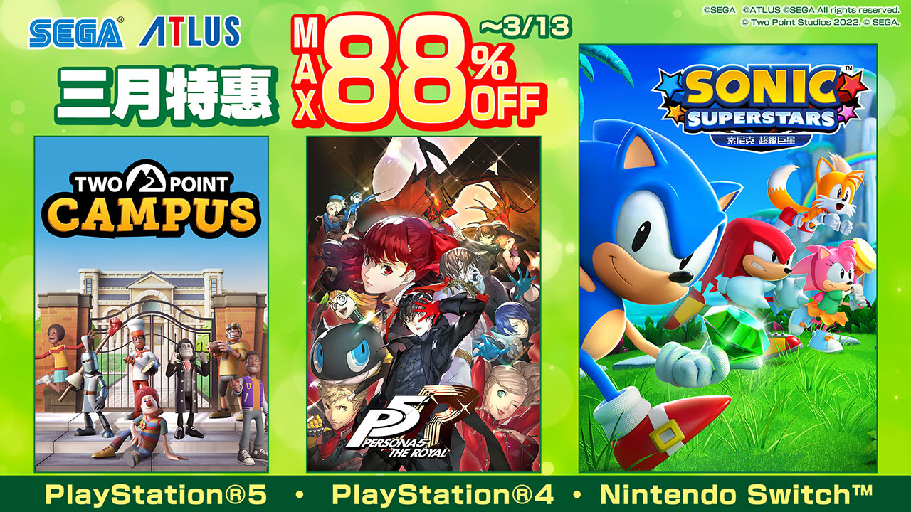 以華麗的3D圖像呈現出充滿個性的區域地圖,能夠盡情享受充滿高速感的橫向卷軸動作遊戲《索尼克 超級巨星》數位豪華版以40%OFF的優惠價格登場。除此之外,描繪了桐生一馬為了追尋遙的孩子‧遙人父親的線索而動身前往廣島‧尾道仁涯町故事的《人中之龍6 生命詩篇。》,以及以經營理想校園為目標,包含遊戲本篇與下載內容的經營模擬遊戲套組《Two Point Campus:腦洞同捆包》也加入特賣行列。