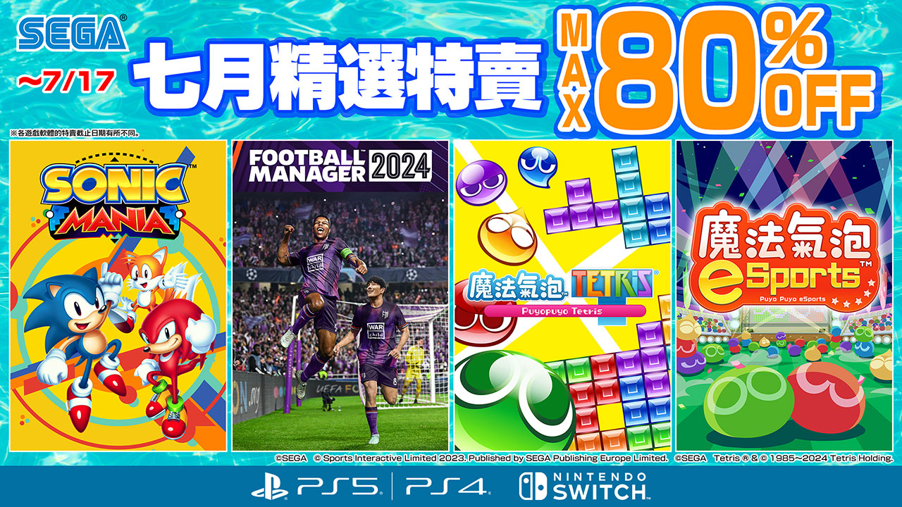 風靡全球的人氣系列《足球經理》系列20周年紀念作品《足球經理 2024 主機版》將以50%OFF的優惠價格於特賣中登場。除此之外,在過去發售的知名關卡中新增要素全面革新之外,還收錄了新關卡的《SONIC MANIA》以及收錄了2種讓對戰白熱化規則的《魔法氣泡eSports》亦為此次特價商品。