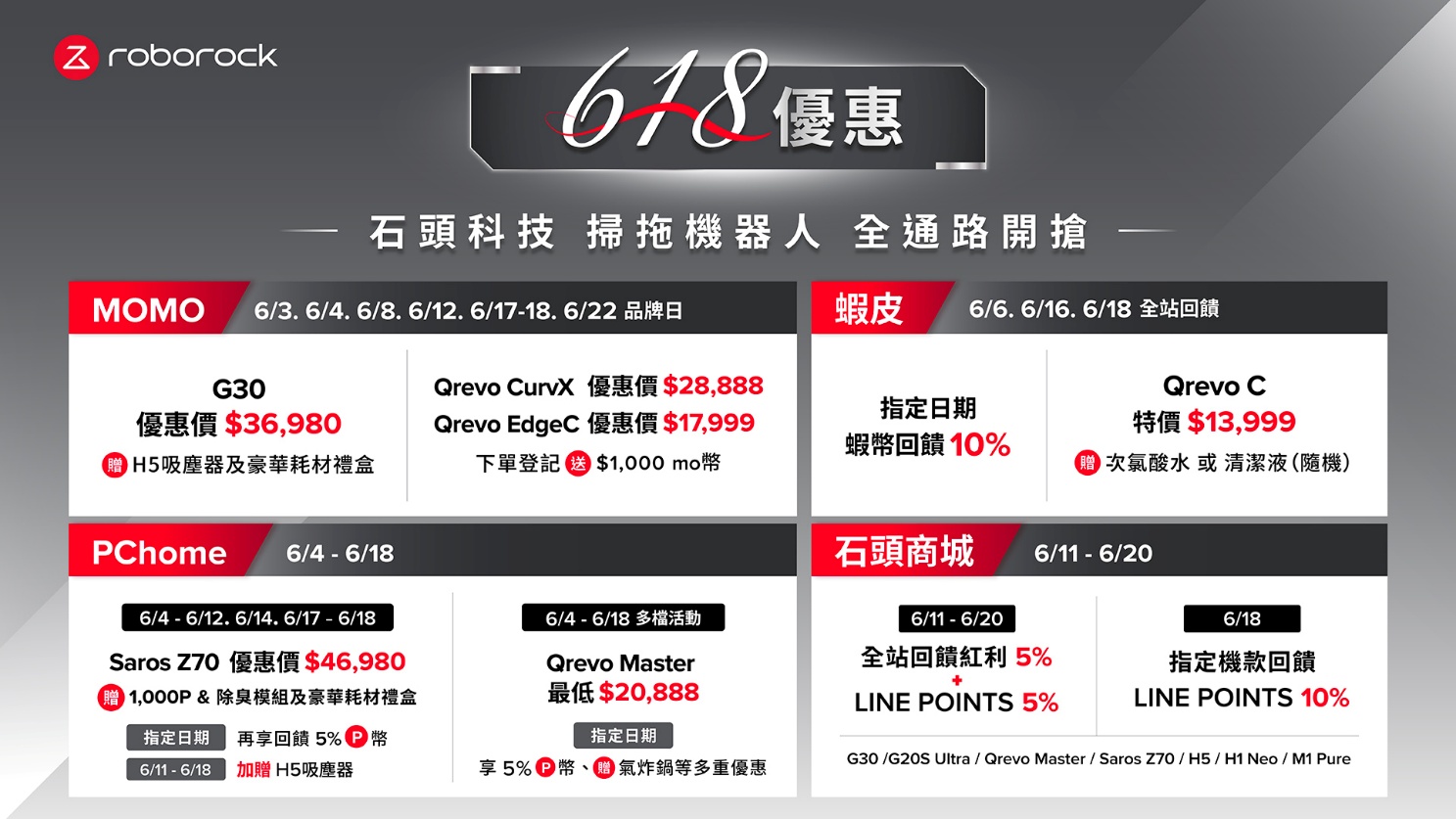 PChome 則針對 Qrevo Master 於 6/4 – 6/18 推出優惠價 $20,888,搭配贈品三井武田氣炸鍋與 5% P 幣回饋;旗艦掃地機 Saros Z70 同步推出滿額送好禮活動;洗地機 Flexi Pro 也祭出 $8,618 優惠價格,涵蓋多元品項。