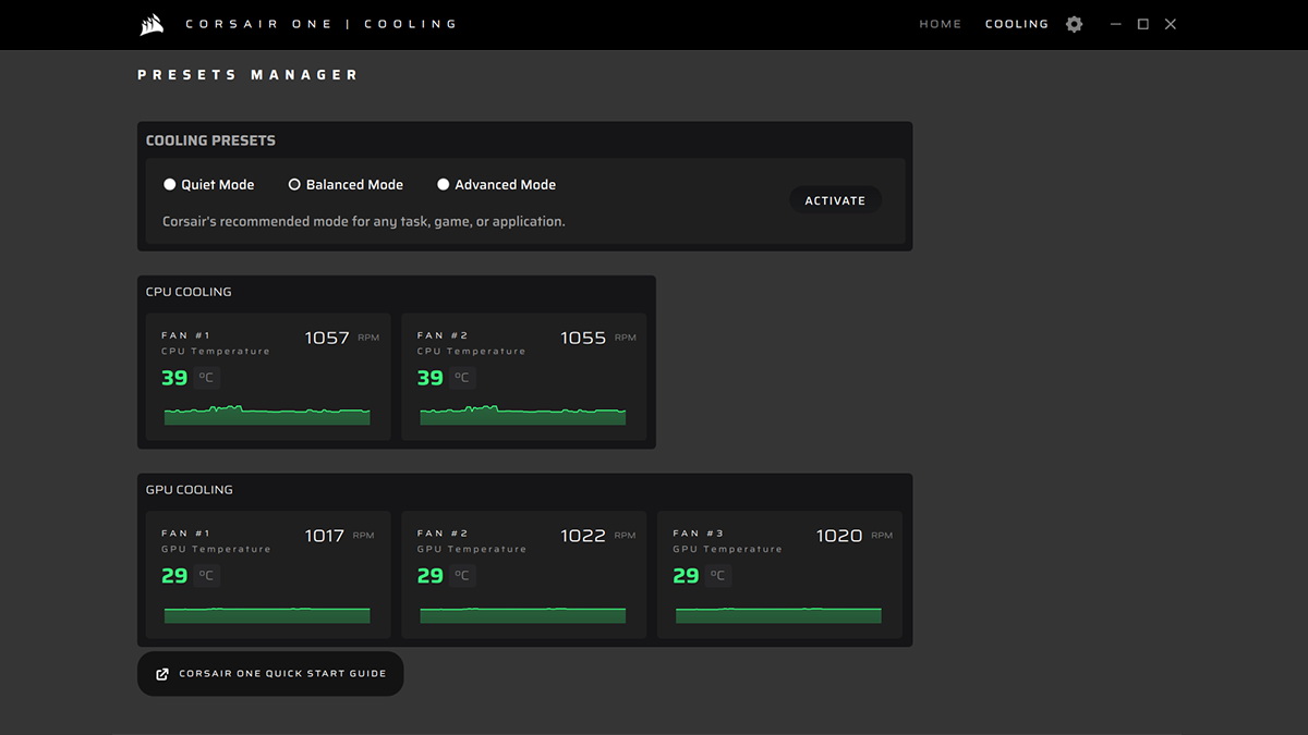 CORSAIR Dashboard Software 是一款專為 CORSAIR ONE i600 PC 設計的專用系統監控和控制工具,進一步提升了自訂功能。這款直覺的應用程式可讓您即時追蹤系統效能,並從靜音、平衡和進階等多種散熱預設模式中進行選擇。對於追求精準操控的用戶,進階模式可完全自訂散熱設置,使用戶能夠根據自身需求微調散熱效能。