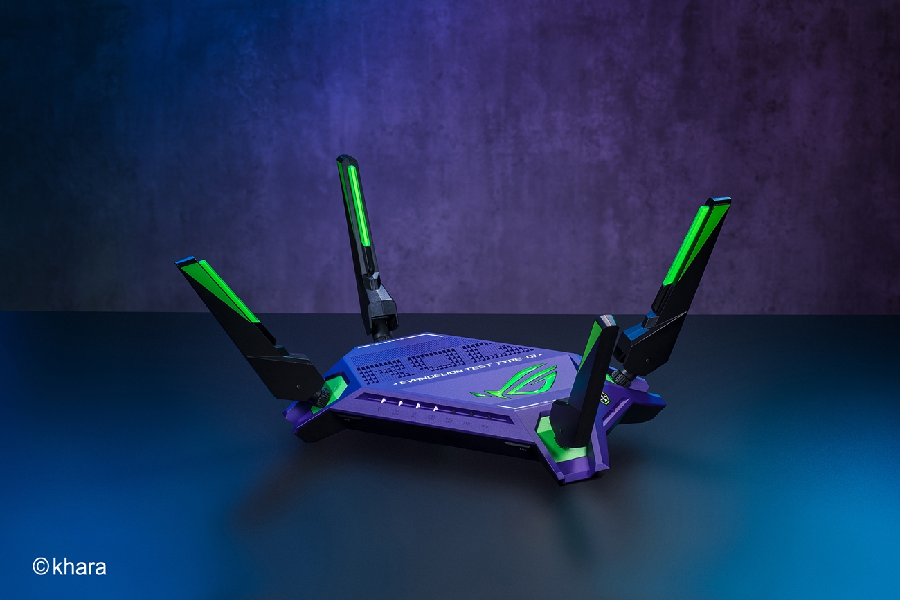 ROG Rapture GT-AX6000 EVA限定版無線路由器,採用頂尖WiFi 6無線技術,以及為玩家而生的高速傳輸Gaming埠;天線以EVA初號機肩部拘束器樣式設計,並配有ARGB酷炫燈效;專屬App介面更以A.T.力場樣式及初號機動態呈現,完美演繹《新世紀福音戰士》名著格調!建議售價:NT$12,990。