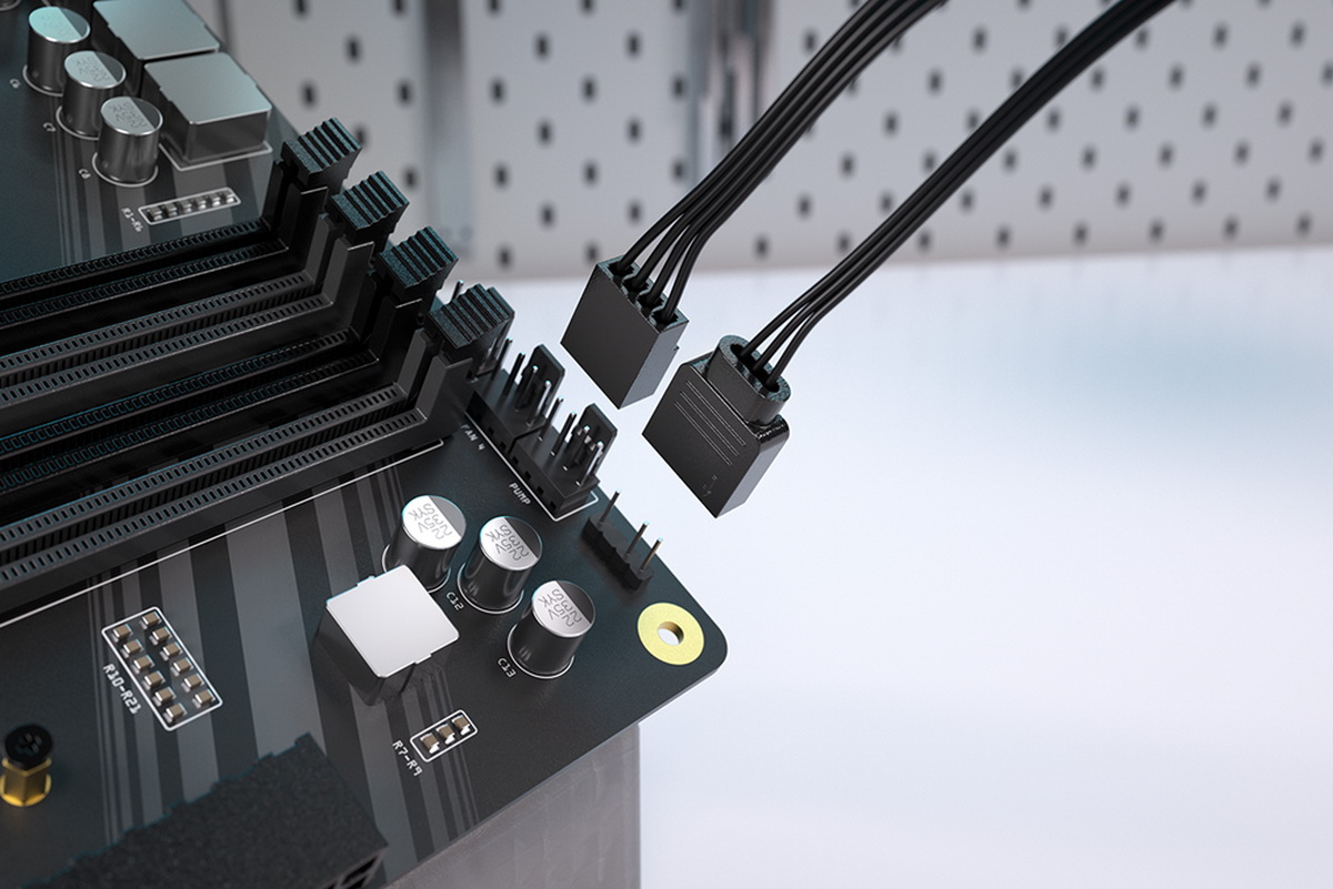 RS-R 系列風扇易於安裝,其精簡的線纜管理設計可讓每個風扇依序連接,減少纜線雜亂,並配有一個 4 針 PWM 介面和一個 +5V ARGB 介面。此設定可提供動態燈光,避免了不必要的複雜性,同時無需額外的控制器,即可透過主機板軟體完全控制風扇轉速和燈光。