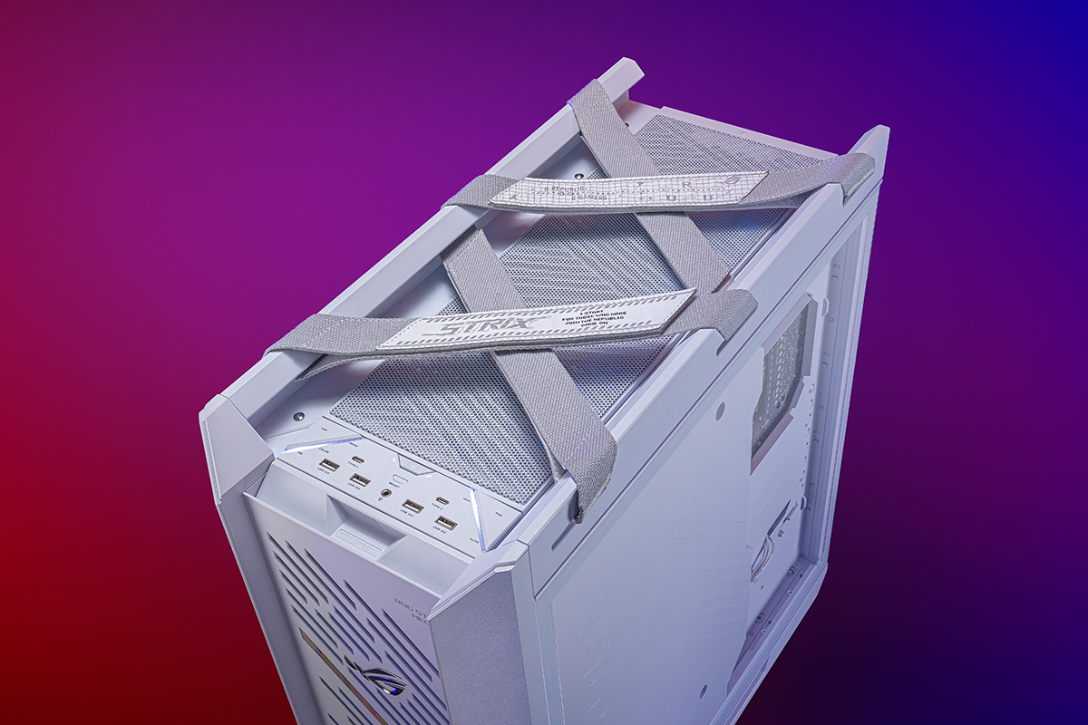 全新ROG Strix Helios II配置4個USB 3.0,並升級為2個支援20Gbps傳輸與60W快充功能的 USB-C®連接埠,還有耳麥孔、獨立電源、重置、LED等控制按鈕,操作升級皆隨心所欲;獨特的雙X型編織提把,握感穩固、耐用好提,方便攜帶搬運,參加LAN Party更輕鬆無負擔。