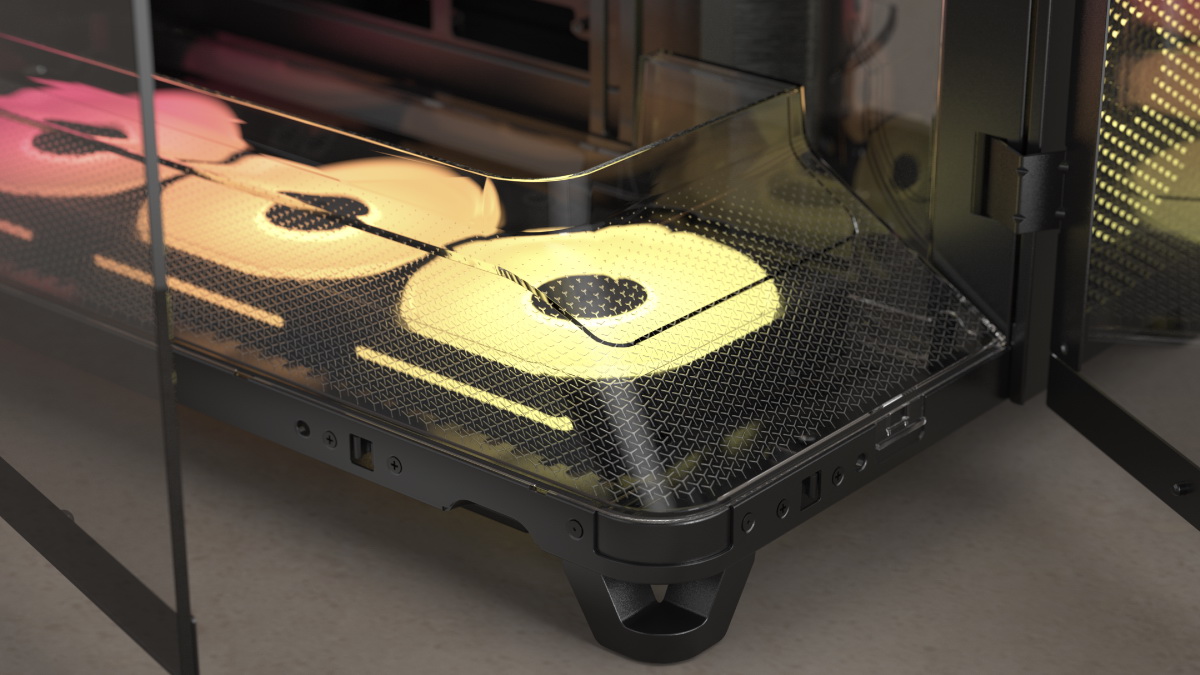 這款現代化的頂部I/O面板配備3個USB Type-C介面:兩個5Gb/s,一個10Gb/s,可實現高速檔案傳輸;此外還有麥克風/耳機介面和電源按鈕。機殼還內建防下垂穩定臂、可重複使用的機殼螺絲收納盒、QuikTurn®快拆螺絲(方便快速安裝風扇)以及用於擦拭玻璃面板的超細纖維拋光布。