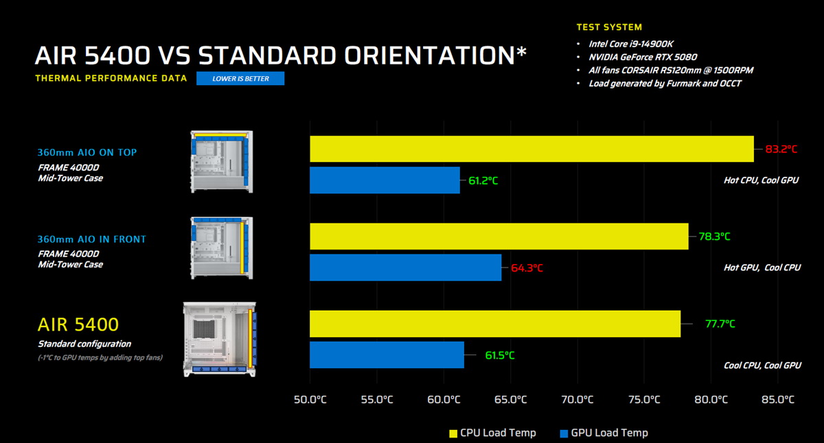 AIR 5400 機箱原型於 2025 年 5 月亮相,一推出便榮獲多項“台北國際電腦展最佳產品獎”,為 ATX 中塔機箱的視覺效果和散熱性能樹立了全新標竿。其三艙佈局突破了傳統機箱設計,新增的第三個艙室專為 360mm 一體式 (AIO) CPU 水冷散熱器(需另購)而設計。大多數單艙和雙艙機箱需要將 AIO 安裝在機箱頂部,這樣 CPU 散熱器會吸入由 GPU 加熱的空氣,從而降低 CPU 的散熱效率。