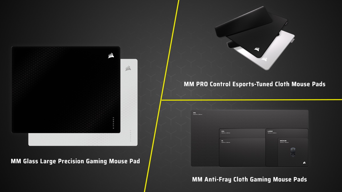 MM 玻璃大號精密遊戲滑鼠墊、MM PRO Control 電競專用布質滑鼠墊和 MM 防磨損布質遊戲滑鼠墊皆可從 CORSAIR 線上商店和 CORSAIR 全球授權零售商和經銷商網路購買。