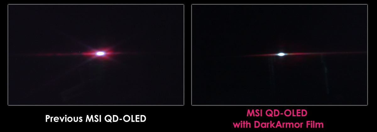 「MPG 322UR QD-OLED X24」與「MAG 321UP QD-OLED X24」皆搭載MSI最新「DarkArmor 薄膜顯示技術」,此項專屬薄膜技術可強化光線吸收效率,消除一般QD-OLED在環境光下常見的紫色或偏紅色偏問題,讓畫面更純淨。透過強化黑階表現,純黑深度最高可提升至40%,顯著拉開對比層次,帶來更出色的整體畫質。同時,顯示器表面硬度由2H升級至3H,提供2.5倍的抗刮能力,能更從容應對日常使用中的磨耗與刮痕,兼顧視覺表現與長期耐用性。