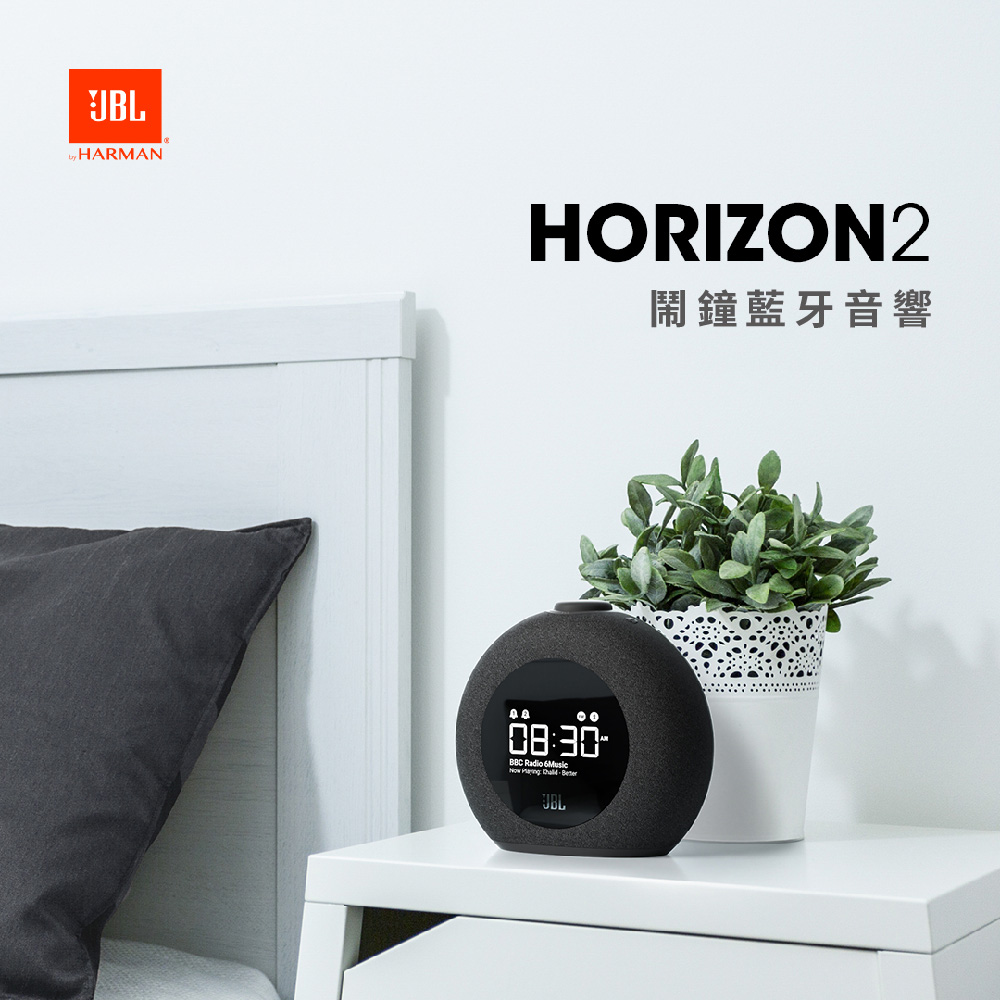 JBL Horizon 2 時鐘收音機不僅可以喚醒您,它的 FM 廣播電台還可以與您為伴。通過三個方便的預設按鈕可直達您的收藏電台。