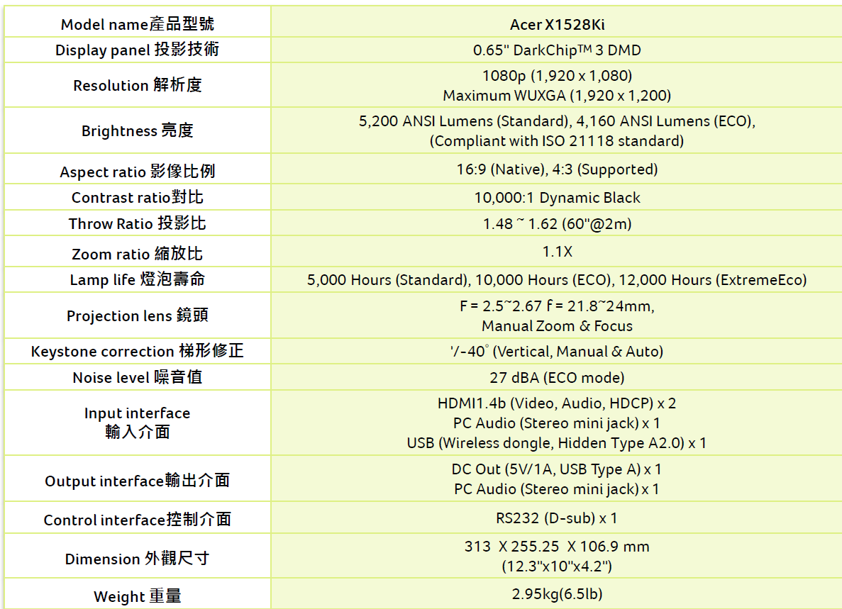 Acer超值Full HD無線投影機《X1528Ki》符合娛樂及商務使用,擁有高亮度 5200 ANSI 流明,超越業界Full HD 亮度僅3000-4000 ANSI 流明、具高動態對比率1萬比1,黑白對比分明,展現驚人細節;透過Acer無線傳輸器直接從支援Miracast 技術的智慧型手機、筆電或桌機進行即時鏡像無線投影,不需連接多餘複雜的線路,使用便利。