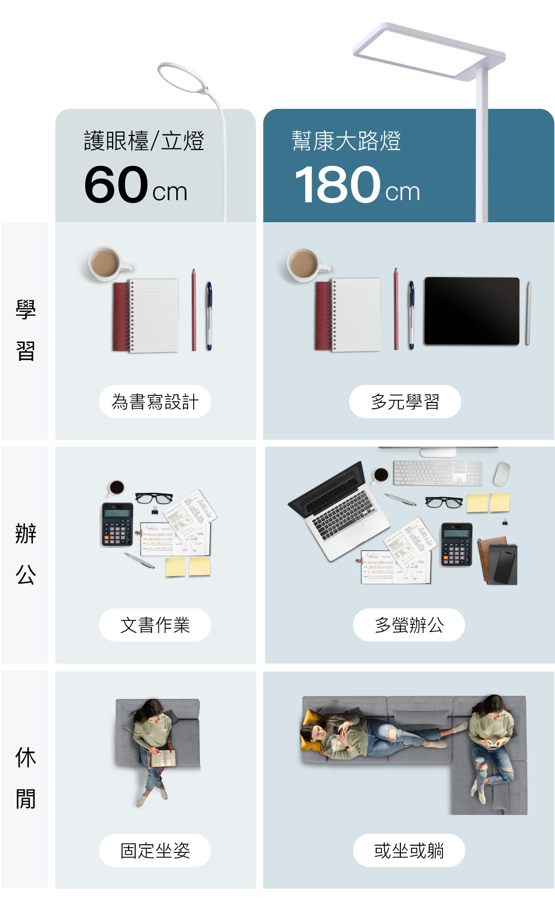 現代人處於多螢環境,無論是辦公、寫作業、閱讀,可能不斷在筆電、平板、手機、書籍或文件講義等多種用眼裝置或物體中切換,只能重點照明一個小區塊或方向的傳統定向式檯燈,已無法達到減緩眼睛疲勞、保護視力的效果。