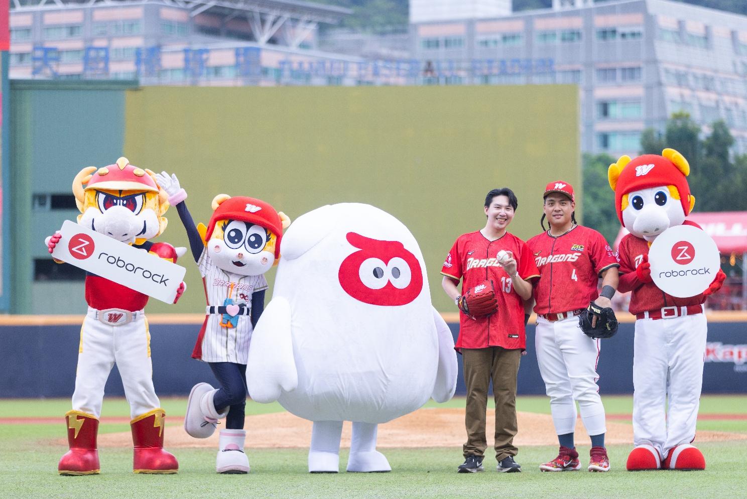 ▲Roborock 石頭科技台灣行銷經理鄭軍睿(右三)與石頭科技吉祥物Rocky(左三)一同開球,為球賽揭開序幕。
