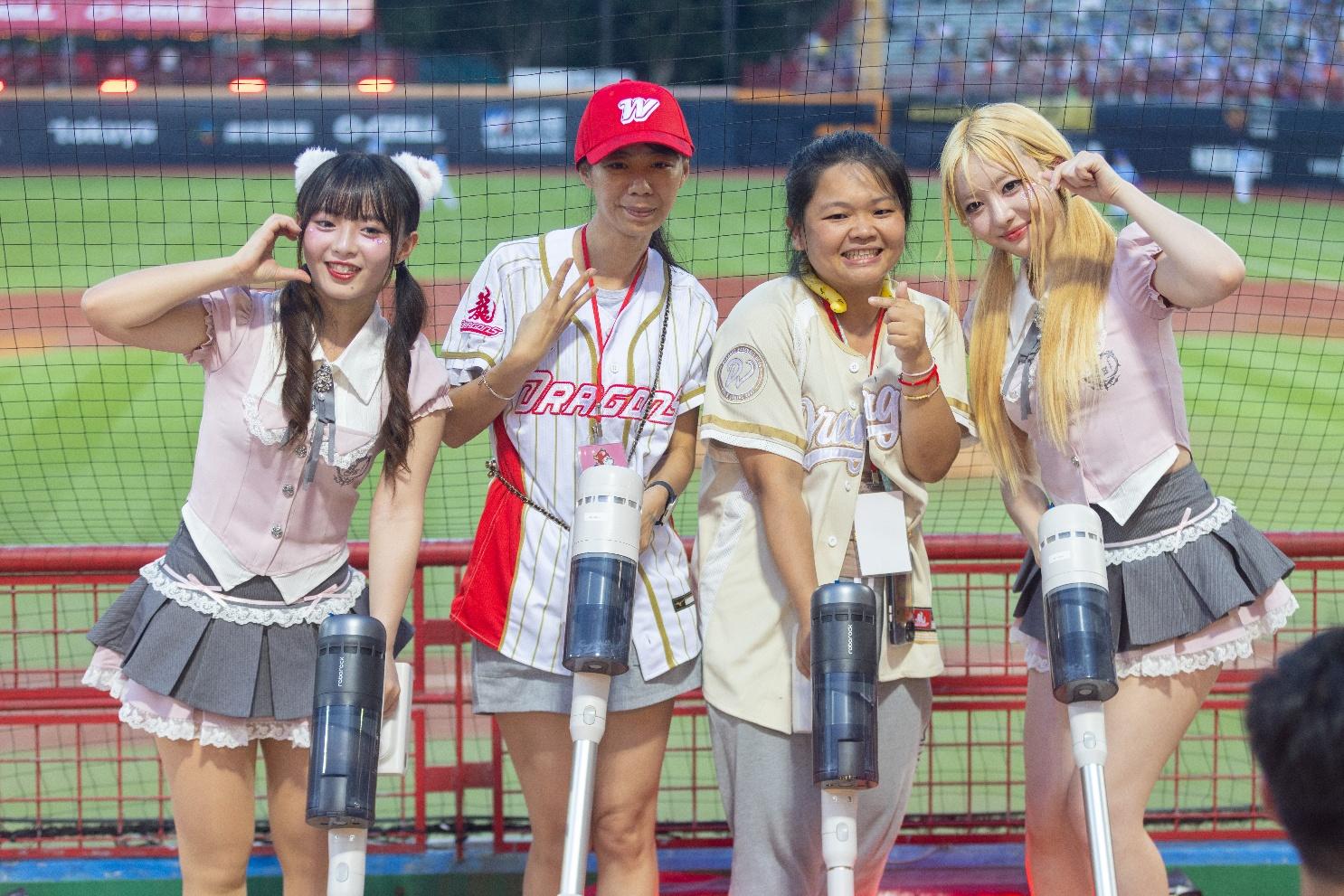 ▲味全龍啦啦隊成員詩雅(左一)與韓籍新成員權喜原(右一)攜手粉絲,體驗 H60 系列吸塵器完成中場清潔任務
