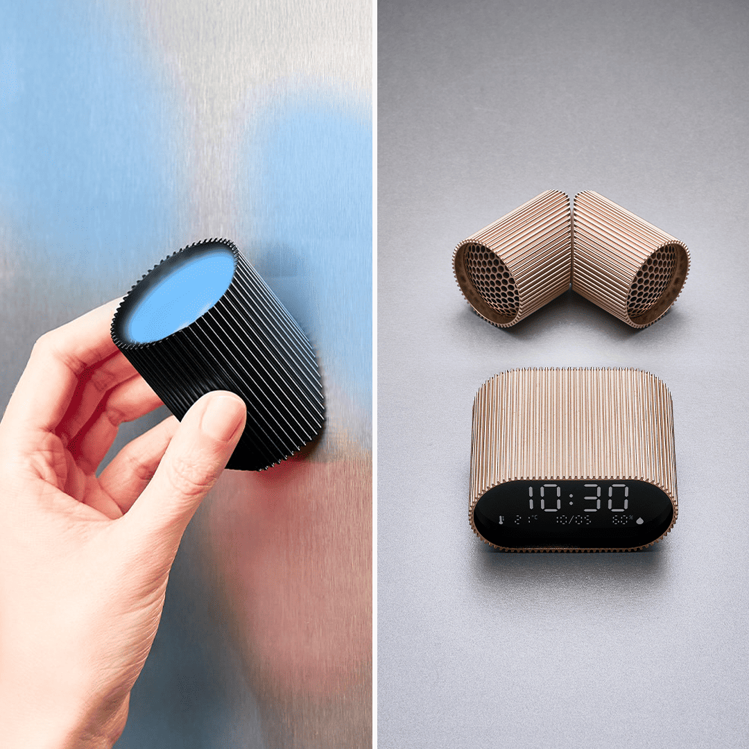 Ray Clock:喚醒時光的優雅觸感 Ray Clock 不只是鬧鐘,更是一件融入生活的設計作品。金屬條紋勾勒出俐落線條,搭配純黑 VA LCD 螢幕,低調卻極具質感。螢幕同時顯示時間、溫度與濕度,讓日常多一分貼心與儀式感。 操作方式簡單而風趣:輕輕傾斜即可關閉鬧鈴,直立則重新啟動;輕觸頂部可喚醒柔和背光,夜裡靜靜陪伴。內建九種鬧鈴音效,從自然聲到音樂旋律,搭配貪睡功能,讓清晨的喚醒變得更溫柔自在。 三款 Ray 系列產品皆由設計師 Neil Poulton 與 LEXON 聯手打造,將光、聲與時間化為日常語彙。兼具功能與美感的設計,讓居家不只是便利,更添一份優雅與互動的趣味。