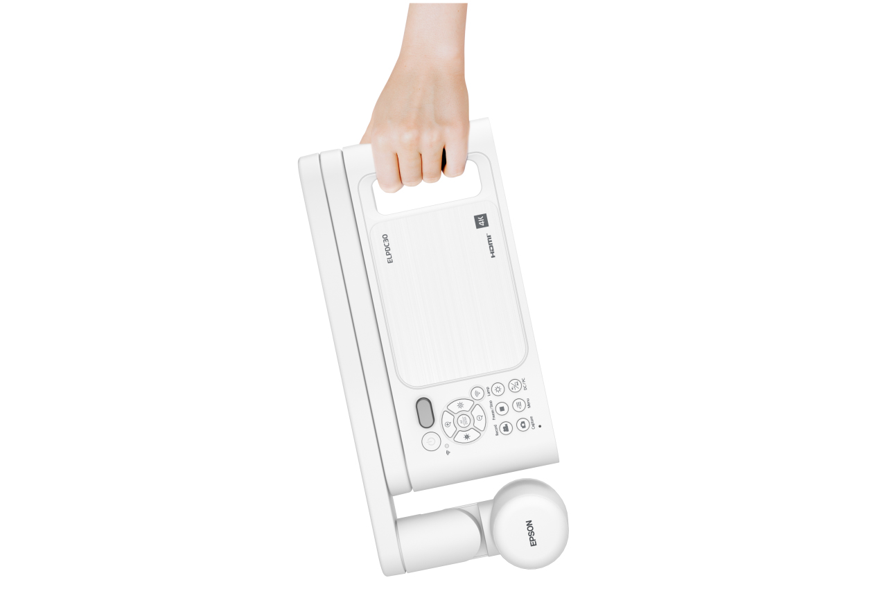 ELPDC30 4K無線實物投影搭載4K超高解析度和1300 萬畫素的鏡頭,可將圖片模型等教材清晰地呈現,即使投影大畫面時,也可顯示銳利、流暢的圖像或影片。新機更具備10 倍光學變焦與23倍數位變焦,總放大倍率高達 230 倍,能夠放大和特寫動態影像與平面、立體等教材。鏡頭旁更安裝LED燈,讓投影出的畫面更加明亮清晰。本次新機在尺寸和機身手柄都進行優化,打造出輕便的機身以便於出門攜帶。此外,穩固的機身搭配可延展的機械手臂,操作起來輕鬆順手,搭載可旋轉式鏡頭,使投影機拍攝視角超越 A3 尺寸。