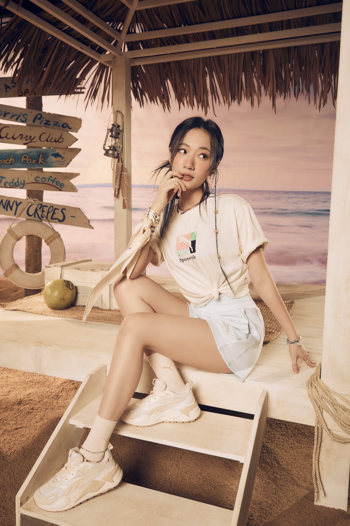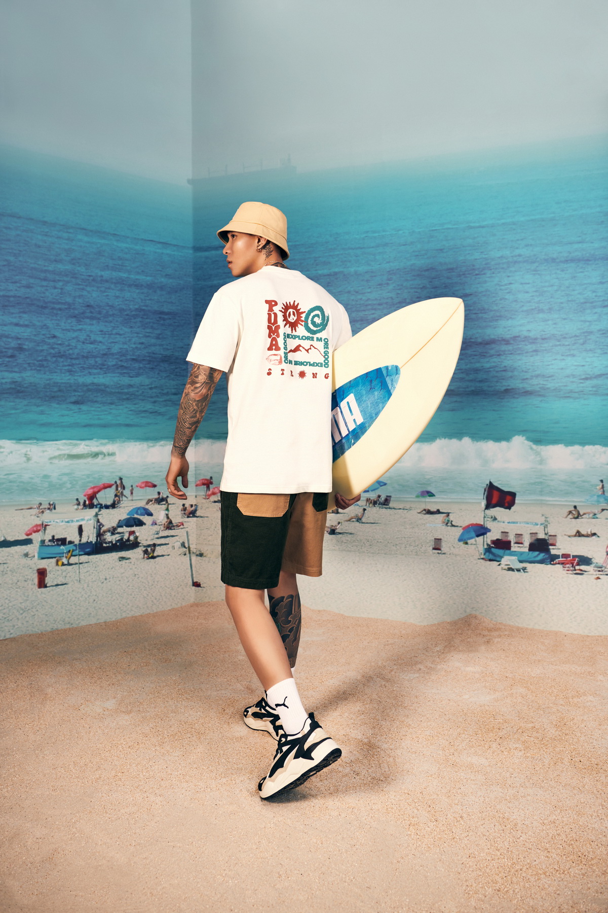 潮流圈三巨頭 E.SO 瘦子、Julia 吳卓源、和謝欣穎分別以夏日海灘祭為背景,搶先穿上 PUMA RS-X EFEKT 復古老爹鞋解鎖今夏人氣穿搭流量密碼。E.SO 瘦子上身欽選 PUMA 純白印花短袖 T 恤,胸前海浪圖騰以及背後 Explore More Good 字樣展現滿滿夏日熱血氛圍,下身搭配 PUMA 拼接撞色燈心絨短褲,為整體穿搭增添繽紛色彩。Julia 吳卓源十足展現陽光女孩的魅力,穿著 PUMA Brand Love 系列短袖 T 恤,下身搭配寶寶粉藍 PUMA T7 高腰短褲,小露性感打造完美身形比例。壓軸登場的謝欣穎則是以波希米亞風展現異國魅力,上身選定大地色 PUMA 羅紋合身短版 T 恤,露出訓練有成的性感腹肌,下身搭配同系列羅紋喇叭褲,上短下長的小心機穿搭法則成功打造9頭身的超模比例,同時以女孩最愛的 PUMA SENSE 植物皮革水桶包點綴, 可說是夏日精品系女孩穿搭指南。