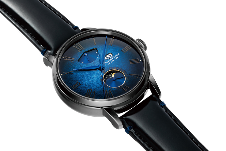 Orient Star錶盤特點即是精細繁瑣的製造工藝與先進的技術。在此款新腕錶中,錶面使用壓印的方式創造出無盡星辰,這些精巧的圖案能夠根據光線進入角度的不同而有所改變,進而打造出閃爍星辰的意象。再者,錶面上使用機器塗上獨特的顏料打造出漸變的效果,細緻地調整錶盤顏色的密度與寬度,使錶盤的中心向外擴散呈現藍色至黑色的獨特色調。最後塗上能夠包覆錶面並具備厚度的透明塗層,為藍色漸變錶盤創造深邃度,展現出夜空中的深度。