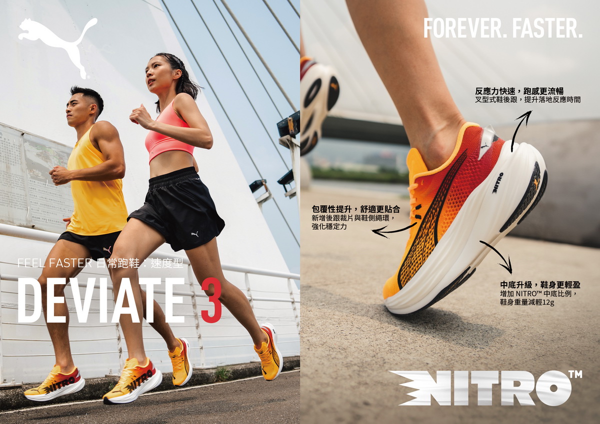 全新機能再升級,第三代 PUMA Deviate NITRO™ 3 全碳板速度型氮氣跑鞋,整體鞋身更輕盈、回彈力更飆升,為夏日的日常練跑成就最堅實的裝備後盾。七月起除了在 PUMA 各大門市專櫃外,跑者們也可在 PUMA 台灣官方購物網站 (https://go.puma.com/taiwan) 直接入手。