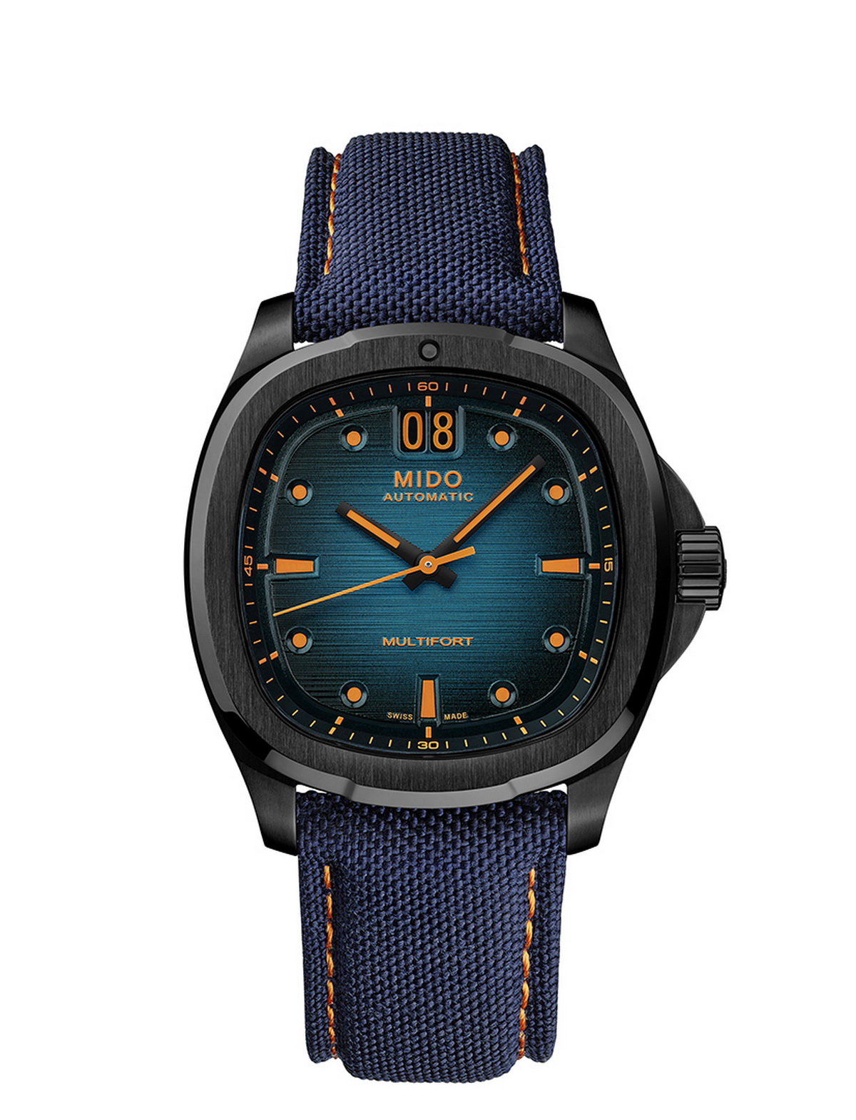 全新 Multifort TV Big Date 雙色新作,無論是俐落的黑黃配色,或充滿活力的藍橘設計,皆完美展現 MIDO 對運動風格、色彩語言與製錶技術的全面掌握。這不只是兩只風格鮮明的腕錶,更是城市節奏中展現個性態度的最佳選擇。