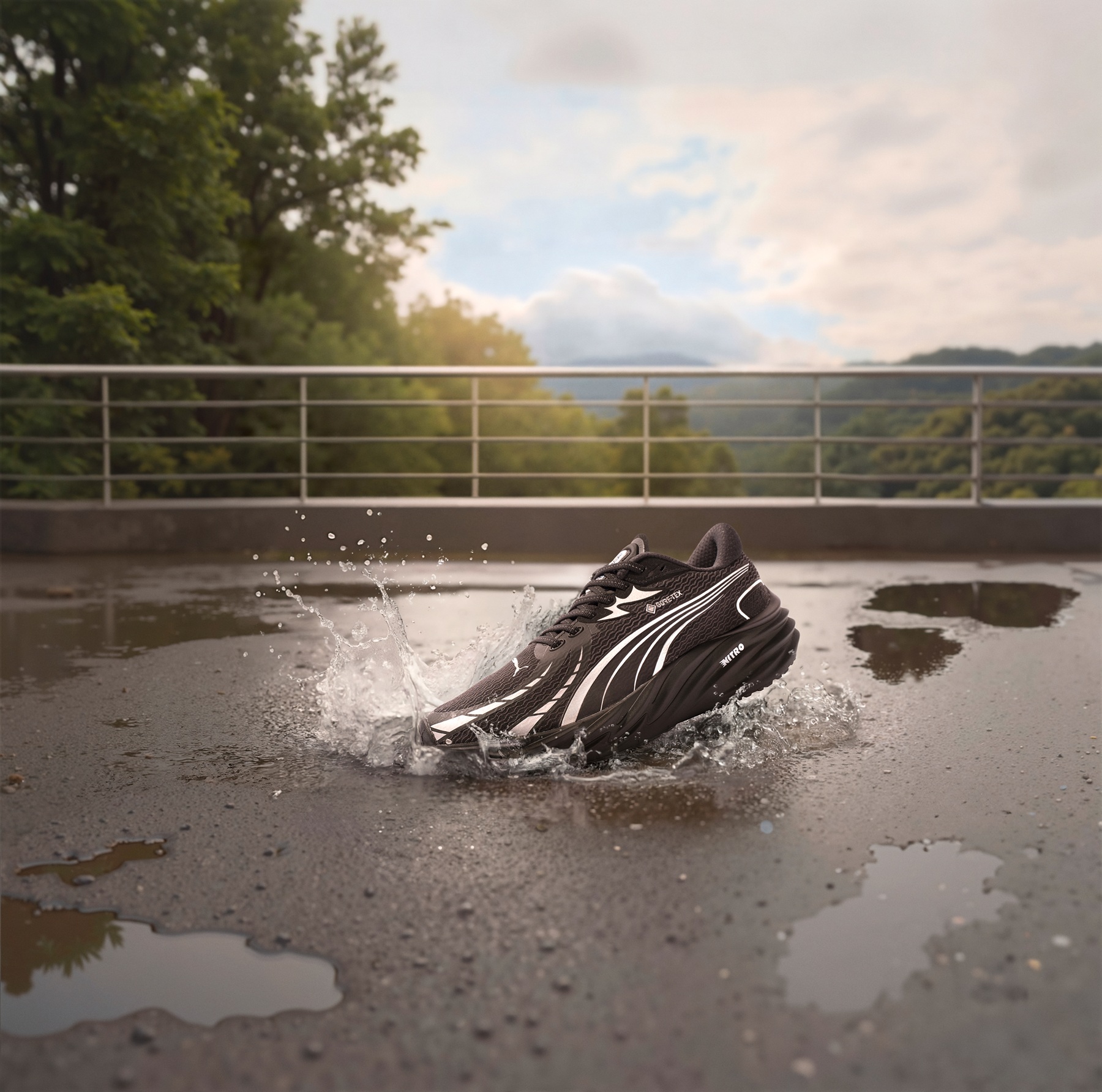 PUMA VELOCITY NITRO™ 4 GTX 在鞋面內層加入 GORE-TEX Invisible Fit 防水薄膜,於維持輕量的同時實現防水、防風與透氣三大功能,Invisible Fit 技術將防水膜「隱於無形」,直接與鞋面貼合,也避免傳統防水結構常見的折痕與縫線磨損,更能有效減少吸水並加速乾燥,維持輕盈與舒適 ;鞋底採用全掌 NITROFOAM™ 氮氣中底,結合 PUMAGRIP 高性能橡膠大底,即使面對雨後濕滑路面,依舊能維持穩定抓地力與流暢步伐。從城市街道到河濱步道,無論晴雨,VELOCITY 4 GTX 都能讓你跑到哪,都是舒適圈!成為你最可靠的全能練跑搭檔。