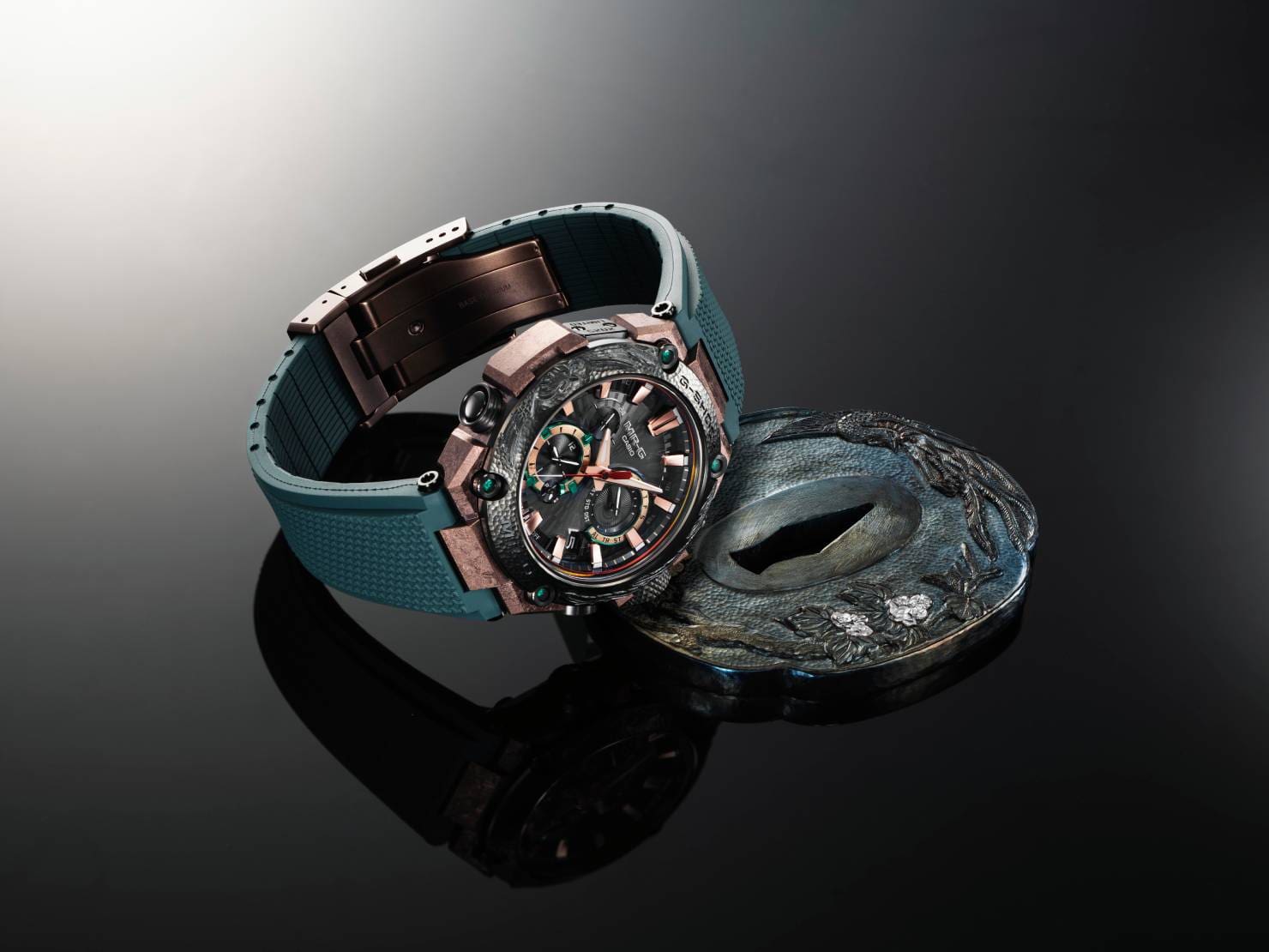 MRG-B2000KT-3A的錶殼覆蓋著純鈦經加熱後所形成的獨特結晶花紋,重現日本刀劍上的「沸」結晶紋理的閃耀美感,錶殼再經深層硬化處理以提升整體硬度,並透過棕色AIP※塗層賦予腕錶日本刀具中常見的溫潤銅色調。錶殼側面9點鐘位置飾有刻著「2025 LIMITED」字樣的金屬牌,低調彰顯限量版腕錶的非凡設計。錶帶則採用飾有幾何毘沙門龜甲紋理的深綠色Dura Soft錶帶,其具備抗變色、抗污漬與抗老化的特性,完美襯托堅固耐用的錶殼,質地柔軟且觸感舒適。鈦金屬錶扣同樣經過深層硬化處理並覆以棕色 AIP 塗層,進一步提升整體耐用性與視覺一致性。透過多項精緻細節的層層堆疊,MRG-B2000KT-3A 將鐵與火交融所孕育的日本刀之力量與美感凝鍊於腕間。