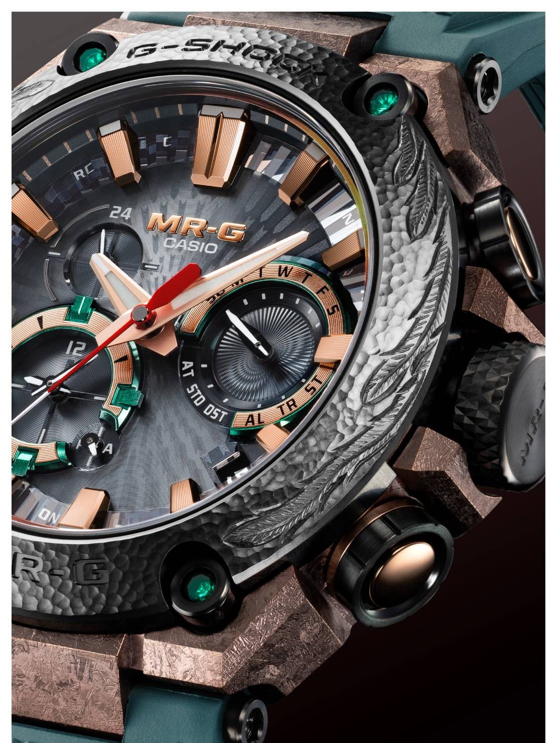 為進一步彰顯匠人雕刻鳳凰所蘊含的威儀感,鈦金屬錶圈經過深層硬化處理後,特別施以深綠色DLC塗層,使外觀呈現出宛如鐵器加熱後所展現的暗藍綠色調,亦即日本傳統文化中備受推崇象徵精緻與優雅的「黑鐵色」,錶圈4顆螺絲鑲嵌祖母綠寶石象徵智慧與洞察真理的力量,寶石的翠綠光澤與深藍綠色的黑鐵色相互輝映,交織出深邃而迷人的光彩層次。錶盤設計則呼應鳳凰羽翼的璀璨色澤,在內環採用紅至橙色的蒸鍍漸層,為整體注入一抹華麗視覺焦點。錶盤點綴被視為能驅邪並引領繁榮未來的箭羽圖紋,微彎的整點刻度其表面帶有細緻磨痕處理,令人聯想到鋒利劍身的優雅弧度,營造出日式傳統設計獨有層次分明且極致細膩的質感。如此精密且高難度的零件組裝與加工工藝,唯有透過CASIO山形廠的超精密製造技術方能實現,完美詮釋MR-G系列腕錶所代表的頂級品質與工藝精神。