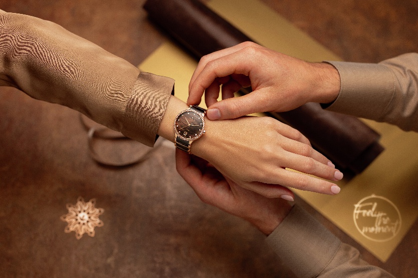 把華麗藏進極簡輪廓裡,才最考驗功力。這一款以 35mm 玫瑰金色 PVD 塗層精鋼錶殼勾勒優雅比例,錶圈鑲嵌 60 顆淨度 VS-SI 的頂級威塞爾頓鑽石,像是為每一分鐘的流動節奏點亮光芒,同時搭配雙面防反光塗層的弧形藍寶石水晶錶鏡,視線清晰純粹。錶盤選用神秘棕色珍珠母貝,並以 11 顆同級鑽石時標呼應,6 點鐘位置設日期窗,在璀璨之外保留日常實用。透過藍寶石水晶底蓋可欣賞 R763 自動機芯律動,機芯經五方位精密調節並搭載 Nivachron™ 游絲,提供 80 小時動力儲存,讓奢華不只停留在外觀,更落在穩定可靠的細節裡。錶鏈以拋光玫瑰金色 PVD 塗層精鋼搭配棕色高科技陶瓷中央鏈節,並以三折式拉絲精鋼錶扣固定,佩戴感與質感同步到位。