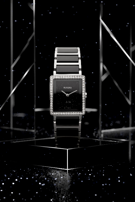 腕錶以方形錶殼與一體式鍊帶勾勒出俐落輪廓,並以鑽石錶圈為整體畫面精準收邊,讓光芒不必張揚也足夠有存在感。錶盤選用黑色砂金石,星點質地被藏在深處,只有在燈下轉動腕間,微光才悄悄浮現,低調卻不肯消失。兩針配置讓視覺更純粹,銀色指針在深黑背景上顯得乾淨俐落;弧形藍寶石水晶鏡面帶來通透讀時與更貼近手腕的視覺弧度。腕錶搭載 Rado calibre R209機芯,並具備 50 米防水,讓這份「把心意說清楚」的答案,不只適合重要時刻,也能被日常長久佩戴。