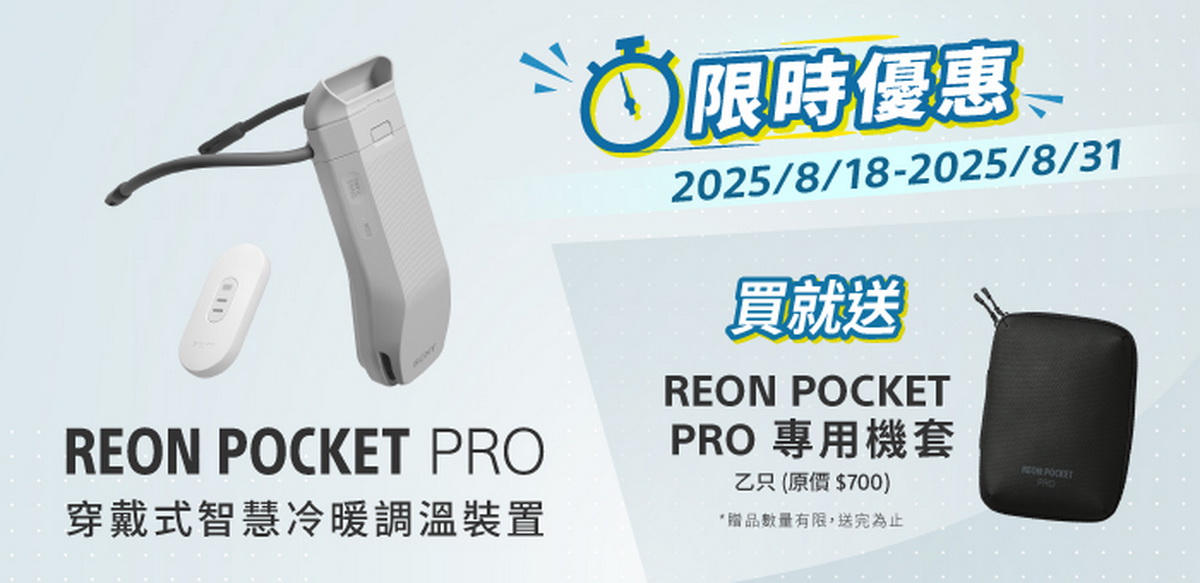 為了回饋消費者的支持與高詢問度,Sony Taiwan即日起推出REON POCKET系列專屬優惠:REON POCKET 5套裝組以優惠價NTD 3,990 (原價NTD 4,490)回饋,而即日起至2025/8/31凡購買REON POCKET PRO套裝組即贈REON POCKET PRO專屬機套(價值NTD 700),把握機會讓個人化的沁涼體感,輕巧隨行整個夏天。