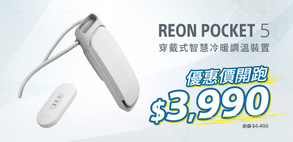 REON POCKET 5系列具備智慧冷暖模式和多重感應功能,可因應環境自動調節溫度,實測使用於35⁰C環境靜置5分鐘後,身體表面溫度即可降至23⁰C[2],能快速提供捷運族或機車族更舒適的體感溫度;具備耐汗水設計的機身亦搭載可根據佩戴狀況自動運作的功能,操作上更簡易方便,無疑是夏日最佳涼伴!REON POCKET 5套裝組即日起推出優惠價NTD 3,990 (原價NTD 4,490),回饋消費者輕鬆入手夏季CP值最高的降溫利器。