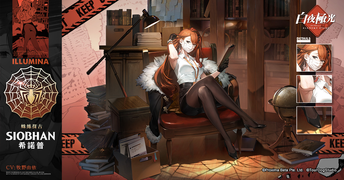 6星,屬性森,稱號蛛絲探古;啟光聯邦的研究人員,工作時理性效率高,私下則慵懶隨性。醉心於古代科技的她常年在外奔波,調查各種遺跡。