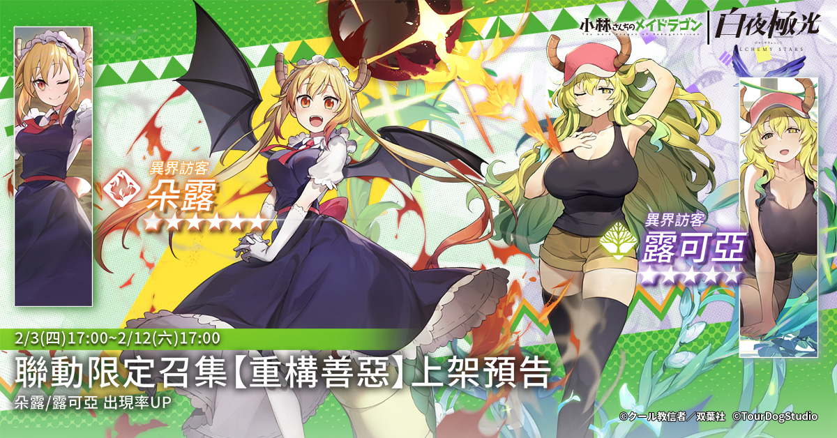 虎年即將來臨,為慶祝春節的到來,《白夜極光》與「小林家的龍女僕」合作,進行首次聯動活動,2月3日17:00至2月12日17:00將開啟聯動限定,新增聯動限定光靈6星「朵露」及5星「露可亞」與其專屬的「重構善惡」卡池,和6星「康娜」及5星「艾爾瑪」專屬的「論外秩序」卡池,並於全服發放包含「露可亞」、「艾爾瑪」兩位聯動限定光靈的龍女僕光靈自選箱。大量福利連續10天發放,有「聯動限定十連召集」及包含聯動限定光靈「法夫納」的「聯動限定每日豪禮」。此外,營運團隊將於1月31日發放1,000光珀,2月1日發放「遠東的道館」背景圖作爲新春特別福利,商城也將上架多款迎春限時優惠禮包,陪伴各位導航員歡度春節假期。