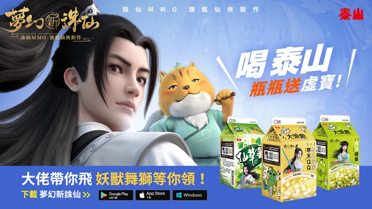 為歡慶《夢幻新誅仙》手遊浪漫上市,與飲料界霸主“泰山飲品”展開合作。3月23日至5月3日,玩家只要到各大超商與全聯購買泰山指定飲品,就有機會獲得“妖獸舞獅”、“閉月羞花頭像框”、“浩瀚星辰氣泡框”等豐富虛寶獎勵。