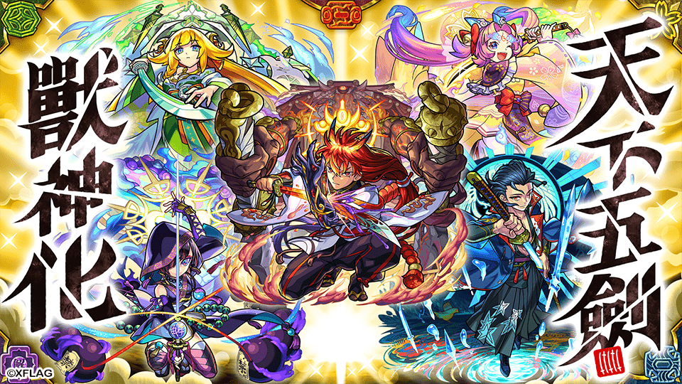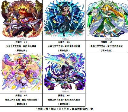 7月11日(一)午夜0:00起,「鬼丸國綱」「童子切安綱」「三日月宗近」「大典太光世」「數珠丸恆次」的獸神化型態將於「集結,天下五劍」轉蛋登場!同時舉辦「保證1體!集結,天下五劍」轉蛋活動,每位玩家都可免費抽一次,並且必可獲得五體其中一體!