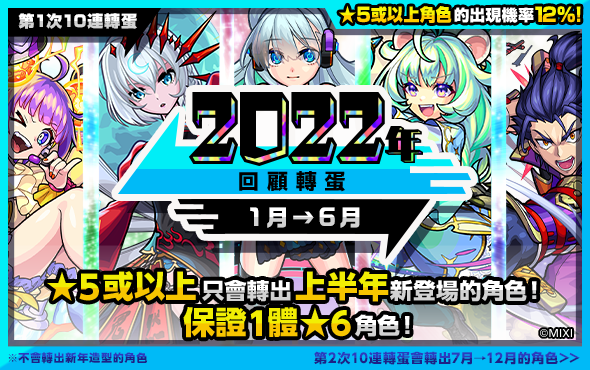 2022回顧轉蛋活動「第1次10連轉蛋」中出現的★5或以上角色,保證是「2022年1〜6月新登場」的角色,至於「第2次10連轉蛋」中出現的★5或以上角色,則保證是「2022年7〜12月新登場」的角色!此外不論第1次還是第2次,抽選10連轉蛋都必定會出現1體「獸神化後(★6)」的角色!