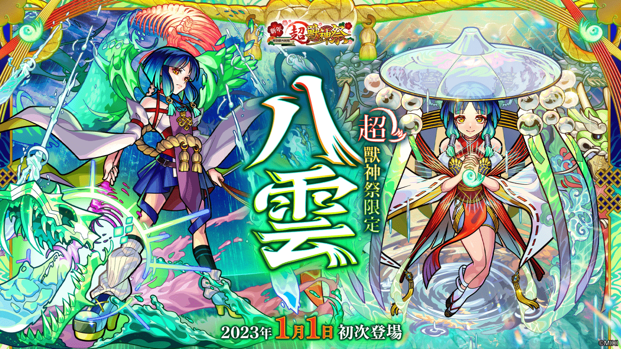 株式會社MIXI所推出的一拉一放戰鬥RPG手機遊戲《怪物彈珠》公開2023年1月1日(日)「新年超獸神祭」中新登場的限定角色「八雲」,並將於2022年12月29日(四)~31日(六)舉辦跨年限定轉蛋、跨年特別節目等一連串的特別活動。