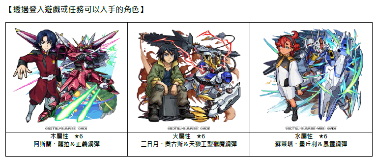 合作活動冒險中「夏亞・阿茲那布爾」「弗爾・伏朗托」「古爾・杰特克」「帕普提瑪斯・西羅克」「亞洲天王」等角色登場。此外,購買「合作活動新手禮包」可以入手「希洛・唯」。而完成合作活動任務「來自地球聯邦軍・吉翁公國軍的指令」,還可以入手「三日月・奧古斯」和「阿斯蘭・薩拉」。作為登入獎勵還能入手「蘇萊塔・墨丘利」。