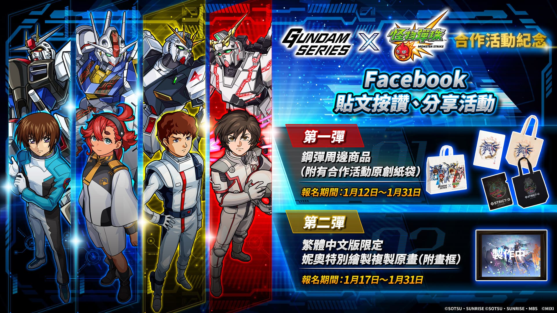 為紀念合作活動開跑,還會舉辦Facebook貼文按讚、分享活動!將抽出36名幸運玩家,贈送「鋼彈周邊商品(附有合作活動原創紙袋)」及「繁體中文版限定妮奧特別繪製複製原畫(附畫框)」等豪華品項!馬上來參加活動吧!並請寫下對合作活動的感想,一起讓本次合作活動更熱絡吧!