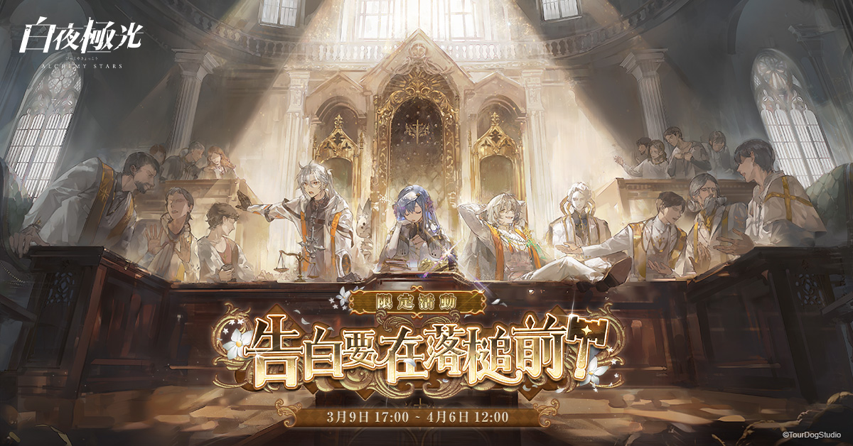 《白夜極光》本次版本更新後,只要導航員完成主線關卡 1-16,即可參與「告白要在落槌前」限時活動。該活動包含線性關卡「告白日」、困難關卡「凋花其後」、活動商店「證物懸賞」、文字冒險遊戲「戀愛審判」、光靈試玩關卡;並推出專屬頭像「睡覺的蒂娜」的「每日期待」限時登入活動,以及特別事件簿第13期二階段活動任務等,只要達成指定條件即可解鎖活動限定豪華獎勵。
