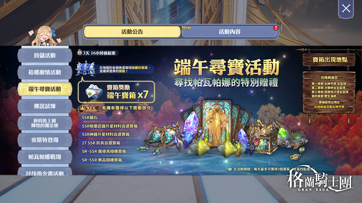 首款3A Lite大世界卡牌RPG《Gran Saga:格蘭騎士團》於今(15)日開放全新風屬性角色「裕娜」,並同步開放專屬劇情活動及格蘭武器,除此之外端午節尋寶副本、神器也將同步限時開放。