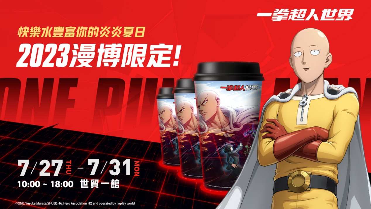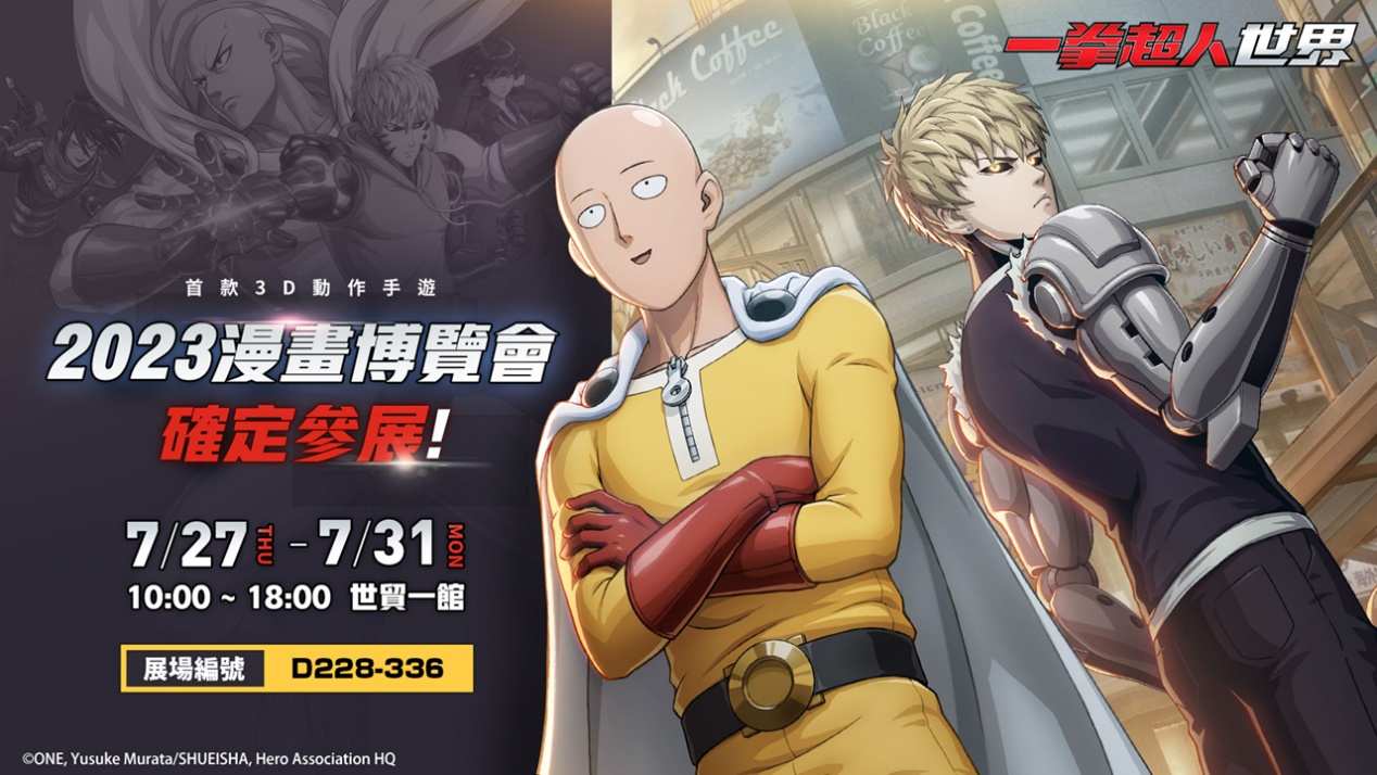 由艾玩天地代理的完美世界遊戲旗下 T3 Studio 所研發的首款一拳超人 3D 動作跨平臺手機遊戲新作《一拳超人:世界》,將進駐於臺北世貿一館所舉辦的第 22 屆漫畫博覽會(D228-336攤位)及香港動漫電玩節(ACGHK2023),首度開放玩家搶先試玩體驗!《一拳超人:世界》為官方正版授權的全新3D動作遊戲,遊戲沿襲原著世界觀設定,主打完整還原動畫原作。本次活動攤位打造互動式場景,真實重現遊戲中的「超市」及「遊戲廳」,現場還設有獨特的XR拍照區,讓玩家化身一拳超人-埼玉,感受成為英雄的熱血快感!