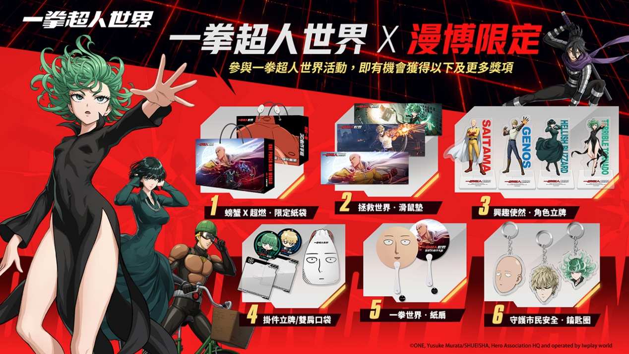 參加現場測試募集活動的玩家即可獲得《一拳超人:世界》限定紙袋。不僅如此,攤位現場設有多項趣味闖關任務等待玩家前來挑戰。玩家將有機會獲得大滑鼠墊、壓克力鑰匙圈、壓克力人形立牌、PP厚卡扇、客制化飲料杯、貼紙等豐富周邊好禮!