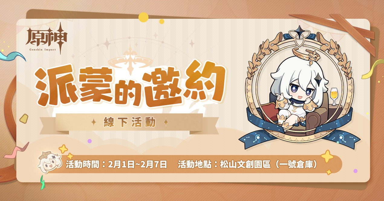 開放世界冒險 RPG《原神》宣布,將於 2 月 1 日至 2 月 7 日期間在台北松山文創園區(一號倉庫)舉辦限時實體活動「派蒙的邀約」,現場活動布置將以「璃月」及「楓丹」為主題,設置簽到、試玩、闖關小任務及周邊販售窗口。同時也準備了豐富的贈品及舞台活動,並邀請到人氣YouTuber「Ru味春捲」及「Kathie Violin 黃品舒」現場演奏《原神》遊戲內的曲目,期待旅行者們一同到場同樂!