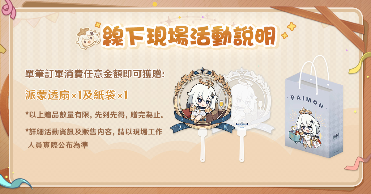 《原神》官方也在活動會場內設置周邊販售區,準備了各式周邊商品供旅行者選購。此外,本次活動單筆訂單任意金額即可獲贈【派蒙透扇】及【派蒙紙袋】!