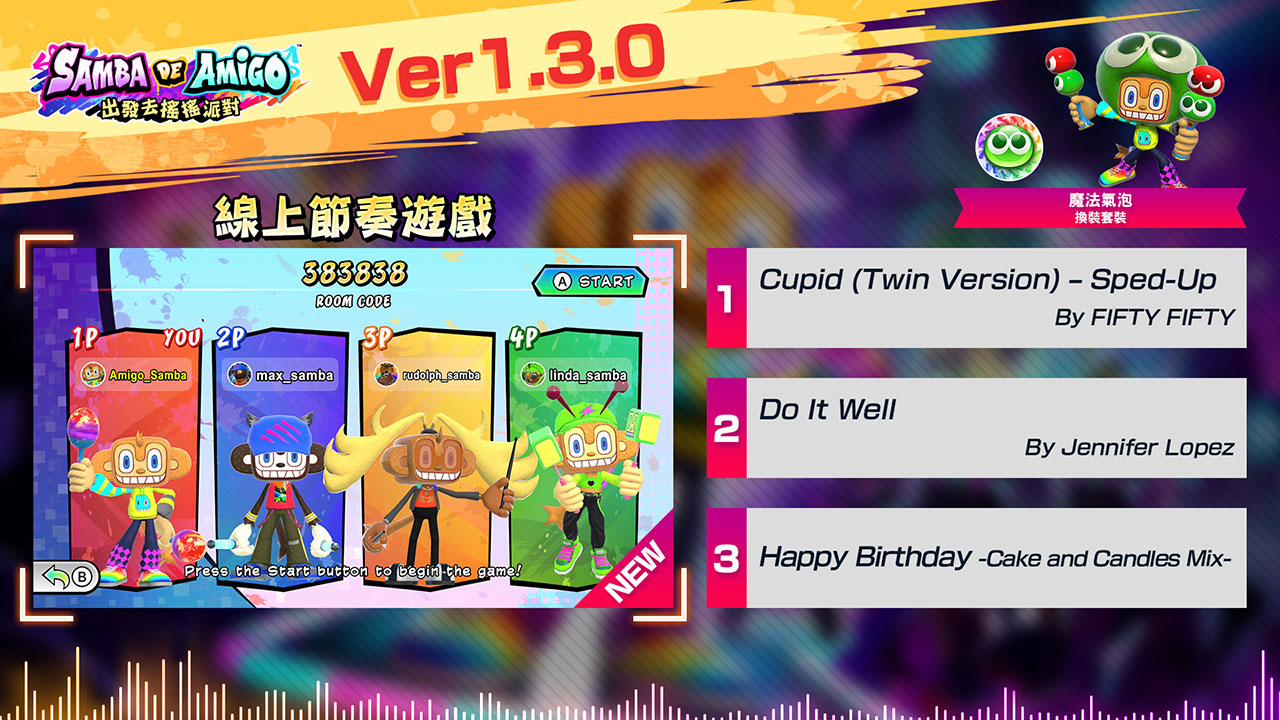 透過本次更新,遊戲中將追加以下樂曲: FIFTY FIFTY 的《Cupid (TwinVersion) – Sped- Up》、Jennifer Lopez 的 《Do It Well》、原創歌曲《Happy Birthday -Cake and Candles Mix-》。除此之外,還能獲得「魔法氣泡換裝套組」。