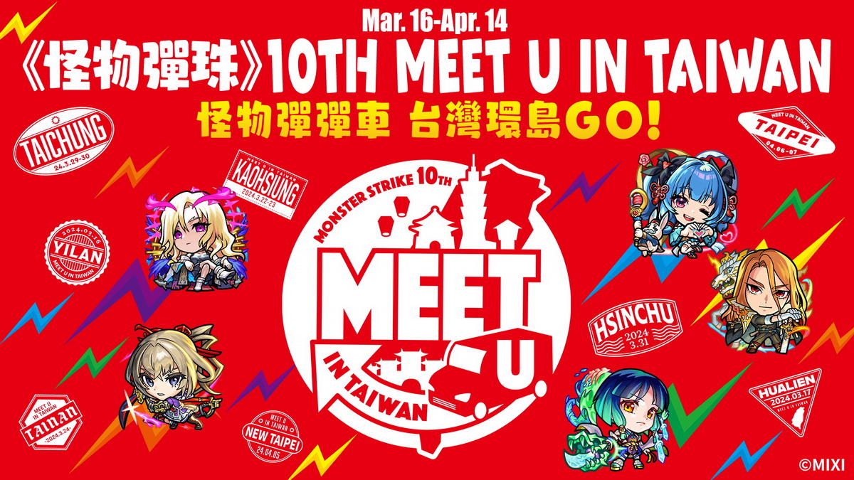 《怪物彈珠》將於2024年5月迎向10週年囉!為迎接10週年做暖身,2024年3月16日起將舉辦「《怪物彈珠》10TH MEET U IN TAIWAN」活動,以「踏足台灣各地」為主要設計概念的彩繪車「怪物彈彈車」,將於活動期間進行環島巡迴活動!這次希望邀請熱愛《怪物彈珠》的彈珠好手們到場共襄盛舉,讓鏡頭記錄下大家對於《怪物彈珠》的點點滴滴回憶!可愛的傲拉龍將跟著彩繪車一起到台灣各地和彈珠好手們見面,各別場次還會邀請MS TWstrikers成員在現場和大家一起遊玩關卡,豐富的活動內容一定不能錯過啦!