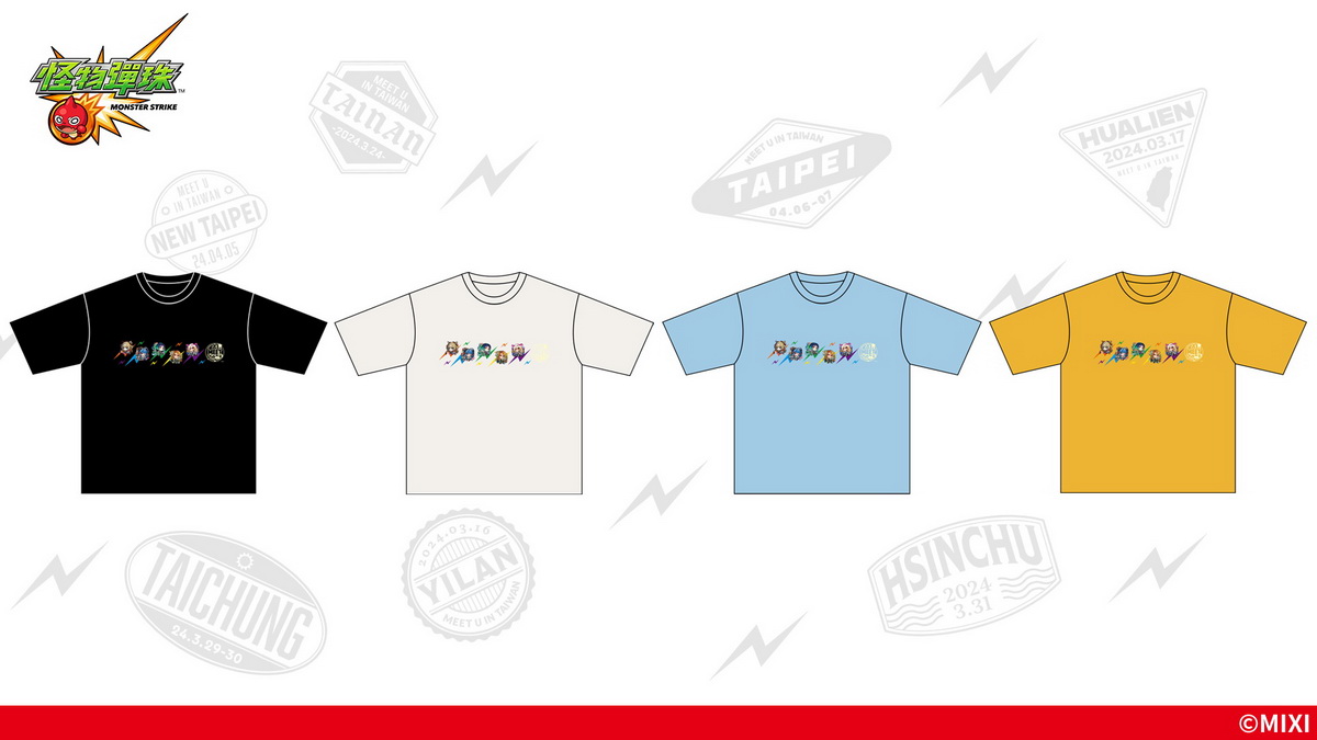 使用「《怪物彈珠》10TH MEET U IN TAIWAN」活動的主視覺設計的特別款T恤(每件NT$880),顏色有「黑、米白、水藍、銘黃」4色可選,尺寸共有「S/M/L/XL」4款,彈珠好手們一定不能錯過!