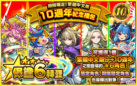 此外,同時推出「期間限定!繁體中文版10週年紀念禮包」,內含「保證★6轉蛋玉」1個和寶珠8個等超值道具,以及「項羽」「劉邦」的讚貼圖!使用「保證★6轉蛋玉」可抽「保證★6轉蛋」,可獲得1體繁體中文版9週年~10週年之間登場的★6角色,包含限定角色、期間限定角色也是轉出對象!
