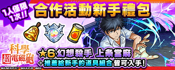 此外,只要購買「合作活動新手禮包」就能以運氣5&等級「極」&「+值」MAX狀態獲得「幻想殺手 上条當麻」,並且在合作活動期間內,能夠以原本的運氣值加上「運氣+99」的效果使用!「幻想殺手 上条當麻」只能透過合作活動新手禮包入手,每人限購1次!