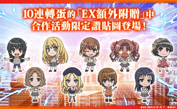 本合作活動中,「御坂美琴」、「白井黑子」、「食蜂操祈」、「初春飾利」、「佐天淚子」會在期間限定的轉蛋中登場,而且以「10連轉蛋」抽轉蛋「科學超電磁砲」還可隨機獲得1款「EX額外附贈」的合作活動限定讚貼圖(共9款)!