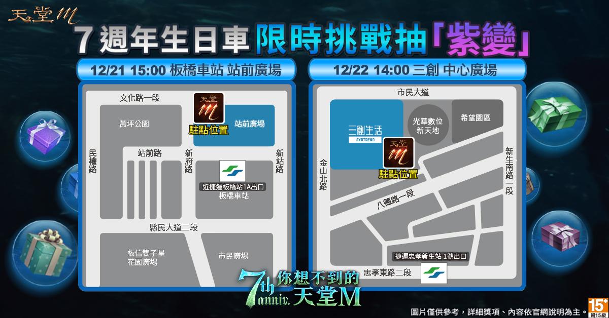 除了線上豪禮大方送,週年歡慶活動也將久違地在線下與玩家見面啦!為期兩天的七週年生日車快閃活動「777紫變挑戰」,即將於12月21日至22日,進駐台北三創中心廣場及新北耶誕城站前廣場,邀請玩家們同樂!現場活動精采絕倫,完成連線777就可以獲得紫變「傳說變身卡選擇箱(活動)」,連線三大職業則可獲取紅變「英雄變身卡選擇箱(活動)」。未順利連線也別擔心,只要參與活動就有機會獲得「綜合神秘的抽卡包選擇箱(活動)」,誠意滿滿的七週年,快來現場尋找你的Lucky Seven吧!除了固定駐點時間,12月18日至12月24日也將不定時現身雙北街頭,近距離與玩家互動,快把握機會尋找生日車的身影,一同感受《天堂M》的七週年驚喜吧!每日獎勵有限,詳細活動方式及獎勵,以現場規畫為主。
